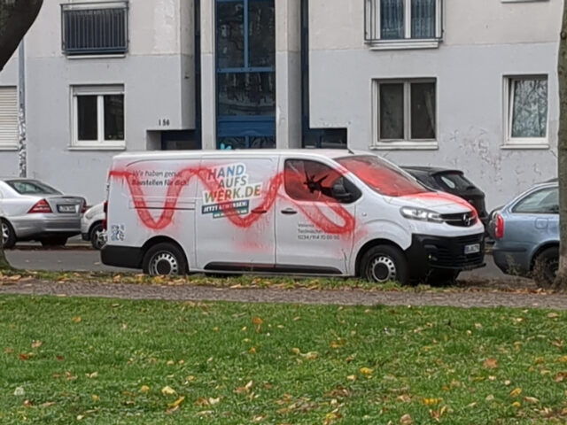 Wir haben am Wochenende ein Auto des Immobilienkonzerns VONOVIA in Leipzig-Connewitz beschädigt und fahruntüchtig gemacht. Das Auto wurde von außen und innen eingefärbt, die Scheiben des Wagens eingeschlagen und alle vier Reifen eingestochen. Warum? Weil wir der Meinung sind, dass Akteure von Gentrifizierung, Modernisierungsvertreibung und Mietwucher eine legitime Zielscheibe für Widerstand sind und als solche auch markiert gehören.