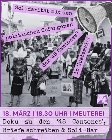 In unserer Veranstaltung wollen wir auf die politischen Gefangenen der ‚48 Cantones‘ aufmerksam machen. ‚Los 48 Cantones‘ ist eine Organisation von 48 Gemeinden (Kommunalregierungen) mit mehrheitlich indigenen Menschen (K’iche) in Totonicapan. Diese existierten bereits vor der Kolonisierung und agieren heute parallel zum Staat. Sie verwalten 50.000 Hektar Wald, betreiben ihr eigenes Rechtssystem, verwalten öffentliche Dienste und schützen die indigene Kultur. Sie funktionieren auf demokratische Weise, unabhängig vom Staat. In der Dokumentation geht es um die Organisierung und das Zusammenleben in der Kommunalregierung, nicht um die Repression gegen die Aktivist*innen.
