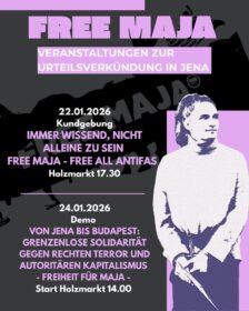 Kundgebung: 22.01.2026 18 Uhr Wilhelm Leuschner Platz, #Leipzig URTEIL IN BUDAPEST Wir wollen euch in Freiheit! Am 22. Januar wird in Budapest voraussichtlich das Urteil gegen Maja und eine weitere Genossin gesprochen. Nach über einem Jahr Isolation und Erniedrigung in Haft für Maja, politisch – motiviertem Vorgehen im Gericht und einer sich zuspitzenden Kriminalisierung der antifaschistischen Prozessbegleitung und Bewegung als […]
