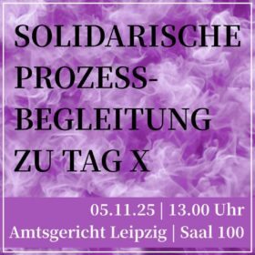 Am 05.11.25 findet um 13.00 Uhr ein weiterer Prozess am Amtsgericht Leipzig im Kontext des Tag-X-Kessels statt. Angeklagt ist eine Person, der Widerstand gegen Vollstreckungsbeamt*innen vorgeworfen wird. In den Tagen nach der Urteilsverkündung im Antifa-Ost-Verfahren am 31.05.23 kam es zu mehreren Protestaktionen in Leipzig und es wurde zu einer Großdemo aufgerufen. Die Stadt Leipzig hatte für das gesamte Wochenende alle […]