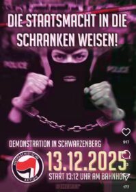 Die antifaschistische Demonstration am 13.12.2025, mit circa 300 Teilnehmenden, richtete sich gegen Hausdurchsuchungen im linken Hausprojekt in Schwarzenberg, einer rechten Schwerpunktregion, in der staatliche Repression und rechter Mob längst ineinandergreifen. In unseren Aufrufen zur Demonstration betonten wir immer wieder, wie wichtig es ist, die Leute vor Ort, die tagtäglich unter Druck stehen, zu unterstützen. Wochen vor der Demonstration gab es […]